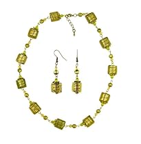 Necklace - Earrings Set - N496 - Murano & Glass Beads + Matching Earrings ~ Green Gold and Olive Squares